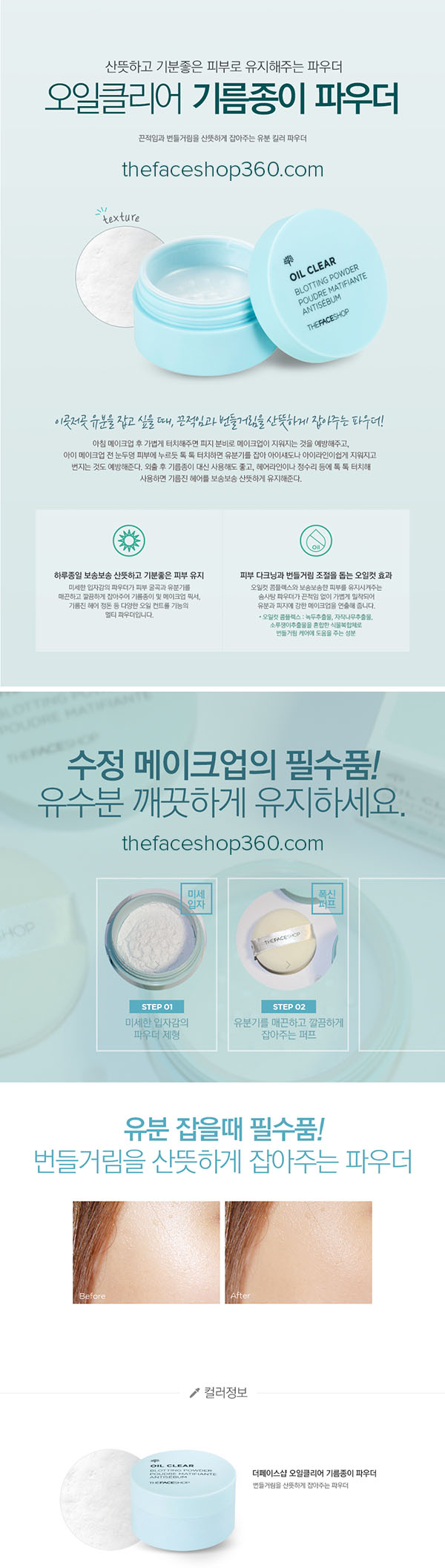 Oil Clear Blotting Power có kết cấu dạng bột, mỏng mịn tựa sa tanh. Sản phẩm như 1 tờ giấy thấm dầu thông minh nhất, xinh đep nhất. Kiểm soát nhờn, giữ lớp make up sáng mịn, tươi tắn suốt nhiều giờ liền. Một trong những dòng phấn phủ bột ưu việt nhất từ The Face Shop.