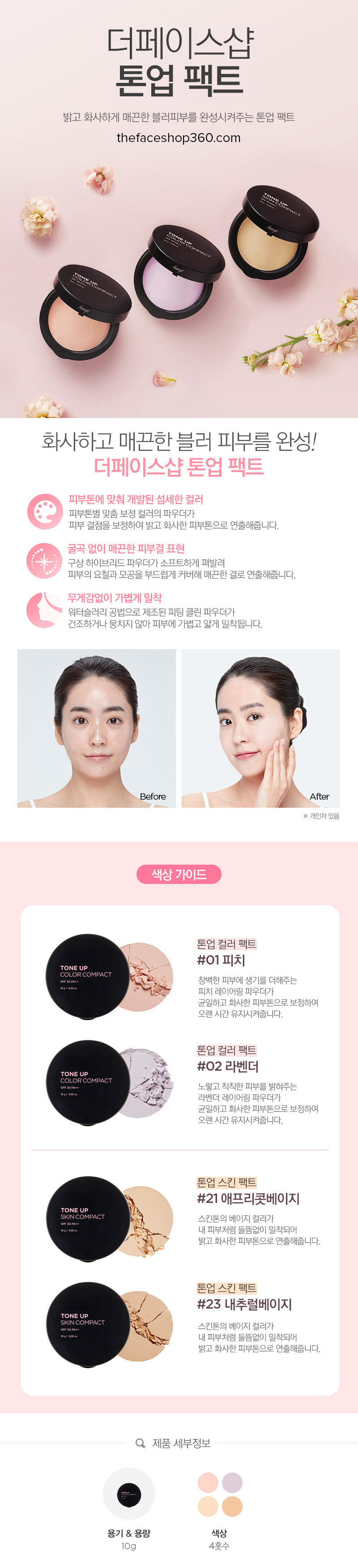 Để cải thiện tình trạng này, The Face Shop đã cho ra đời phấn phủ nâng tone da Tone Up Skin Compact. Hơn thế, sản phẩm có khả năng che phủ và nâng tone màu da giúp lớp nền tự nhiên và bền màu cả ngày. Đây là loại phấn phủ siêu nhẹ, không hề gây cảm giác bí bách cho làn da nếu bạn sử dụng nhiều lớp trang điểm.